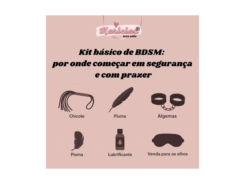 Um kit básico de BDSM deve ser simples, seguro e divertido. Algemas suaves, uma venda, um flogger leve e acessórios de toque já oferecem uma variedade enorme de sensações para explorar.