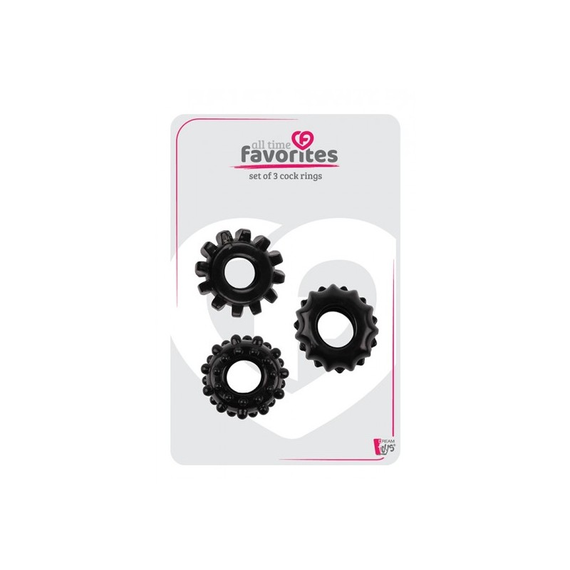 Este conjunto de 3 anéis penianos da etiqueta All Time Favorites apresenta 3 texturas diferentes. São elásticos e devido ao seu ajuste justo garantem ereções duras e duradouras, enquanto a textura a estimula durante a relação sexual.