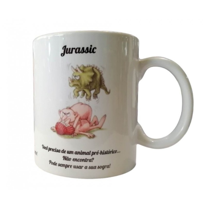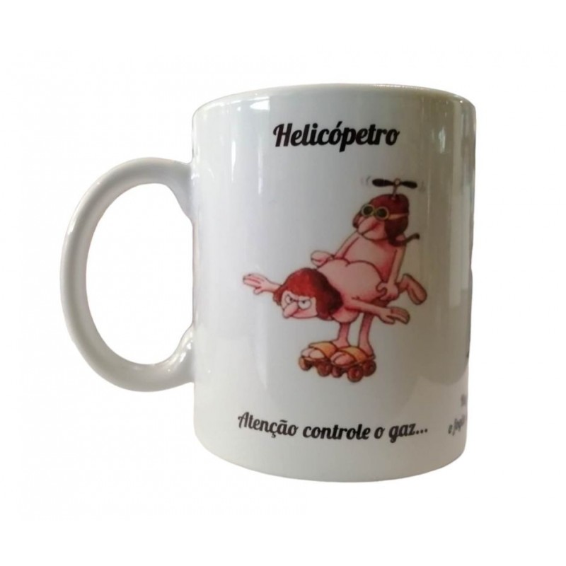 Caneca em cerâmica com varias imagens e texto sobre a imagem.