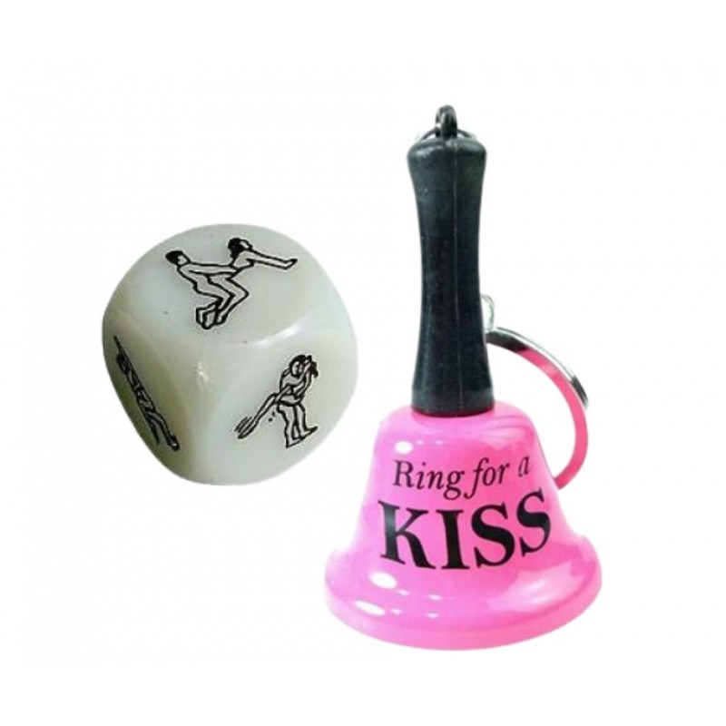 Um chaveiro engraçado com o slogan “Ring for a kiss” e com um dado com posições kamasutra.