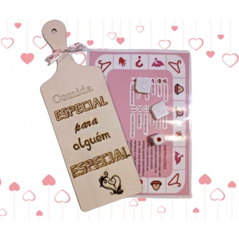 Possui um jogo de tabuleiro para aumentarem a interatividade entre casal com dado e peões. O jogo tem casas com ações que deverão ser feitas com a cara metade e a numeração dos dados corresponde ao local do corpo onde essa ação deverá ser realizada.