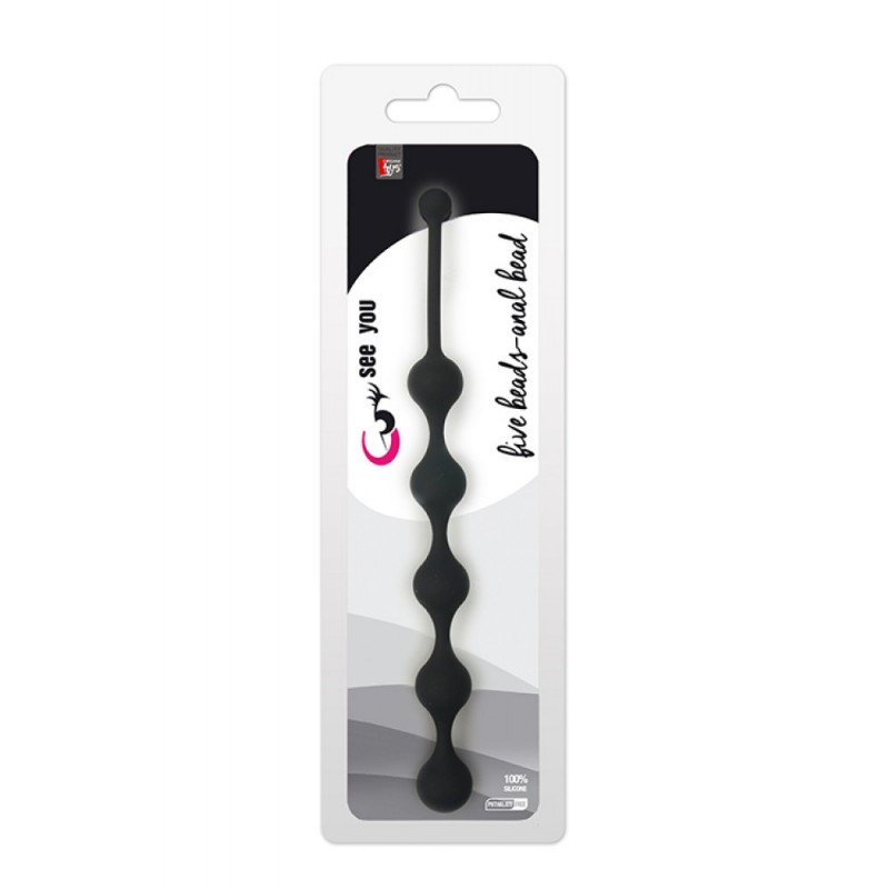Cordão flexível com 5 pérolas, de 2.5cm de diâmetro cada, com peso para brincadeiras anais muito interessantes.