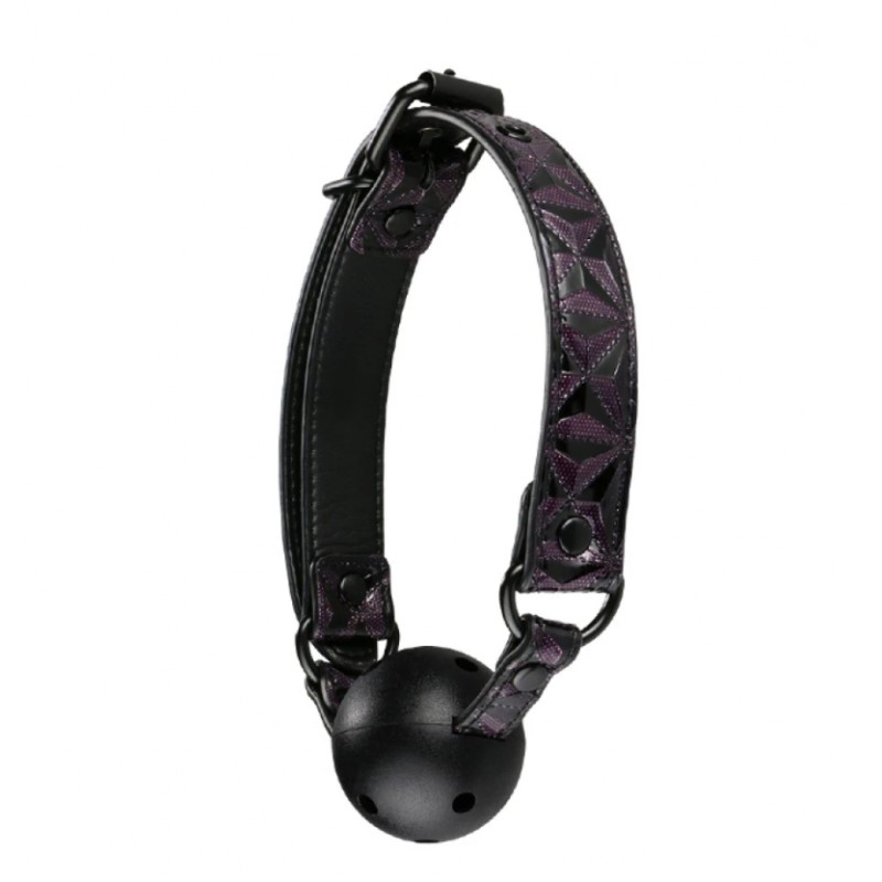 Mordaça em bola perfurada para maior conforto, sem sabor ou odor, presa por tiras ajustáveis.