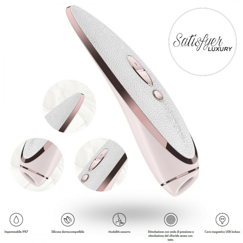Esta joia de luxo foi projetada com detalhes preciosos em mente. Com materiais como couro branco, detalhes em ouro rosa e silicone macio de uso médico, este brinquedo oferece um toque refinado para o seu gosto cultivado e satisfação do clitóris.