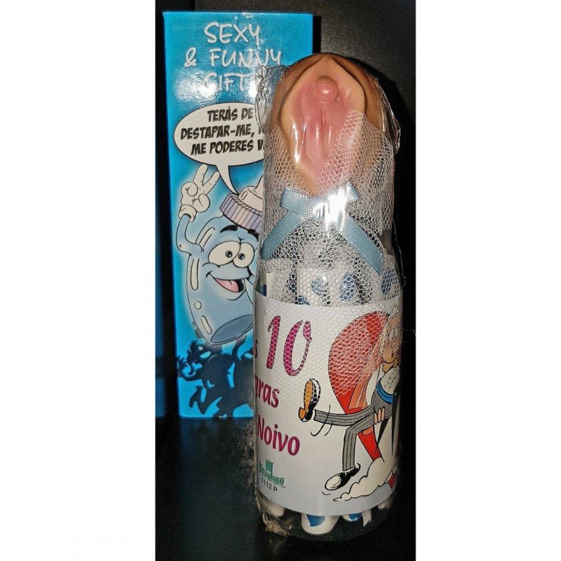 Biberão em forma de vagina com 10 regras para o noivo cumprir. Será um complemento imperdível, para animar uma despedida de solteiros.