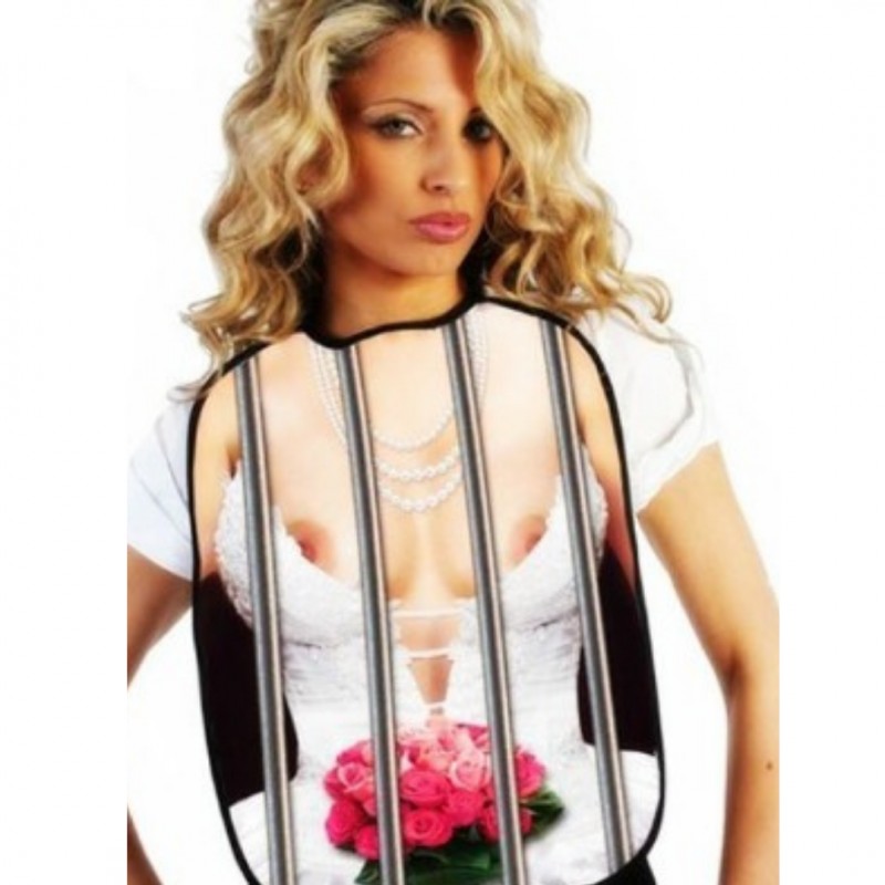 Fabuloso babete inspirado num vestido nupcial com um ramo de flores metido atrás das grades.