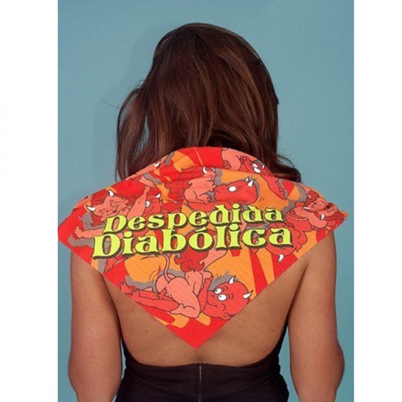 Lenço decorativo com imagens de diabinhos em posições sexuais e inscrição ''Despedida Diabólica''.