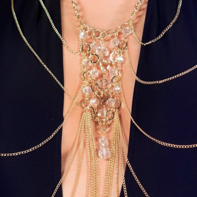 Um colar para o corpo, dourado com correntes de diferentes tamanhos, que se unem na zona do peito, com pendentes brilhantes. Possui fecho ajustável na parte traseira. Uma ideia original para embelezar um vestido ou dar destaque ao corpo com classe e elegância.
